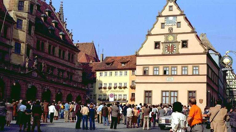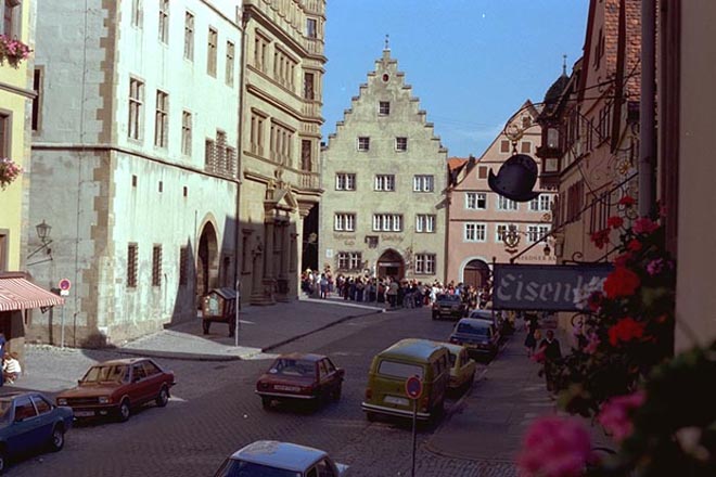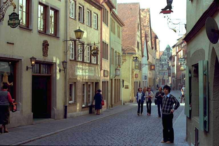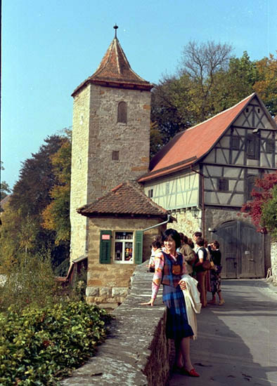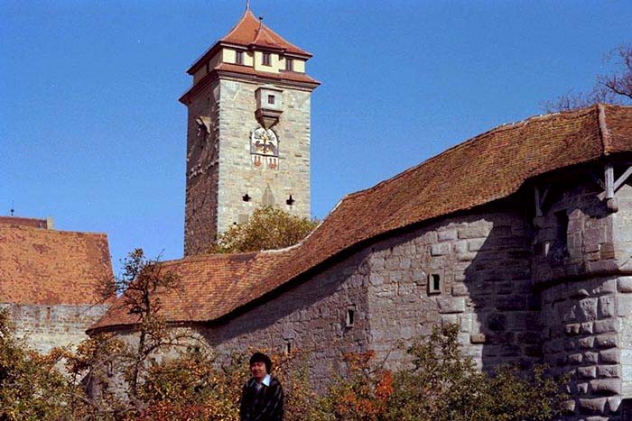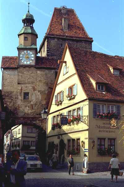 ロマンティック街道はヴュルツブルクを起点とし、南ドイツの中央を南北に貫く行程約200kmの観光ルートです。その90%以上はバイエルン州を通っています。正式名称を<タウバー河畔のローテンブルク>というこの町は、ロマンティック街道の南の終点にあるノイシュヴァンシュタイン城とならんで、街道中最大のハイライトです。ノイシュヴァンシュタイン城が幻想的で孤高の美しさを讃えられるのに対し、ローテンブルクは中世のお伽の町に迷い込んだような錯覚を起こします。1970年代中頃ホンダ=シビックのテレビ・コマーシャルに登場し、一躍有名になりました。最初に作られた町は市庁舎前広場を中心として、半径約100mのほぼ円形の城壁に囲まれています。町は次第に発展し、人口も増えて三度にわたって外側に城壁が拡張されました。その城壁や門塔が見所の一つです。なお、お見せする写真は例えばミスター・カネコの「コッツウォルズの村」のようにネット上公開を想定して撮影したわけではありませんので、前景に全体の雰囲気を壊しかねない日本人の姿が映っていることが多々あります。この点ご容赦ください。そういうときは目を半開きにして見ていただけば多少ぼやけてよいかと存じます。
