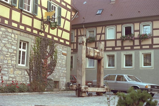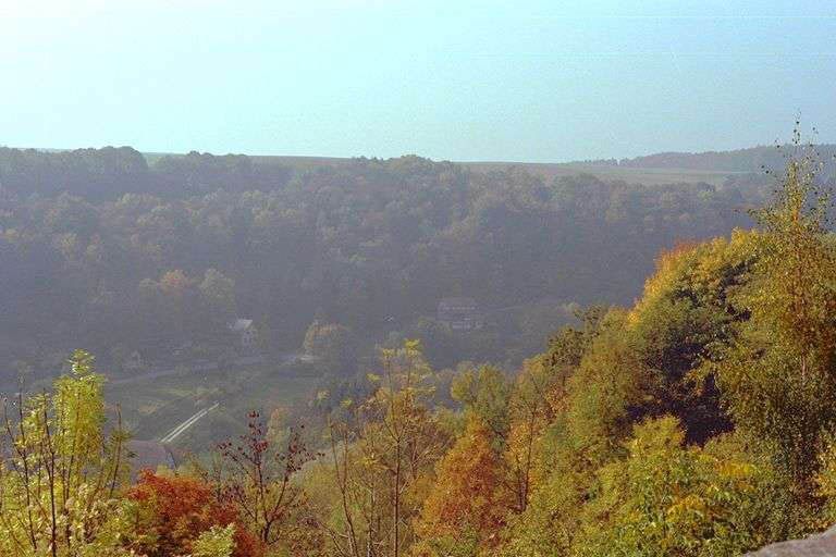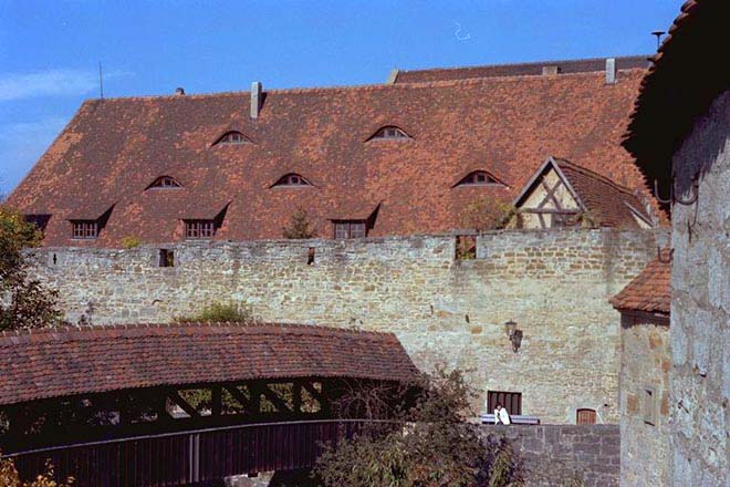 ローテンブルクは深さ40mほどのタウバー渓谷の崖の上に位置しています。晴れた秋の日、タウバー渓谷にゆっくり下りて行くのは、とても美しい散歩です。谷の両側は広々とした台地で、農耕地とその間にローテンブルクのような集落が点在し、渓谷より遙かに広い生活圏が存在しています。これは日本人には見慣れない地形で多少奇妙な印象を受けます。平野が次第に隆起して行くにつれ、川は出来た台地を浸食して低い位置に留まるからです。ドイツではライン川峡谷など、あちこちに見られる地形です。