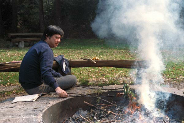 落ち葉を集めて火をおこし、適当な枝に肉や野菜を刺してあぶり、調味料入りの