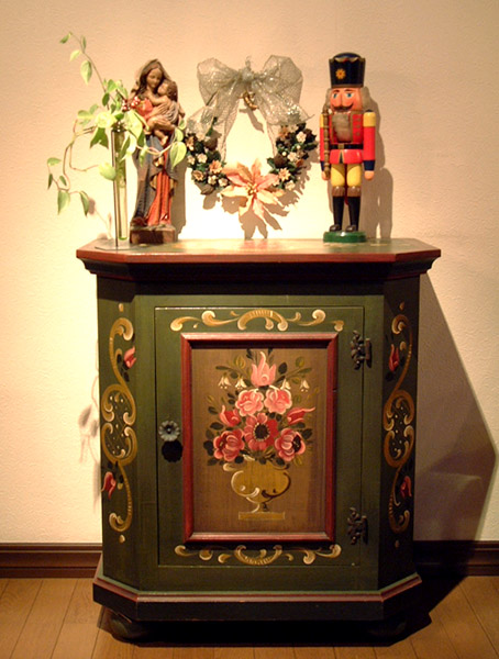 我が家のクルミ割り人形と聖母子像と、花の壁飾り。小戸棚はバイエルンの民芸家具。英語でトール・ペインティングと呼ばれるこのような装飾画の描き方は最近各国でホビーとして広まっています。家具としての構造はドイツ製が一番頑丈です