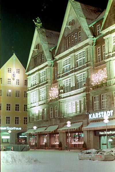 昨日まで大勢の買い物客で賑わったデパートの前も今夜はひっそりと静まり返っています。ただドイツ人の照明のセンスはすばらしい。左手黄色い建物(衣料品専門店)上部には柔らかい光に浮かび上がるマリア像が、、。