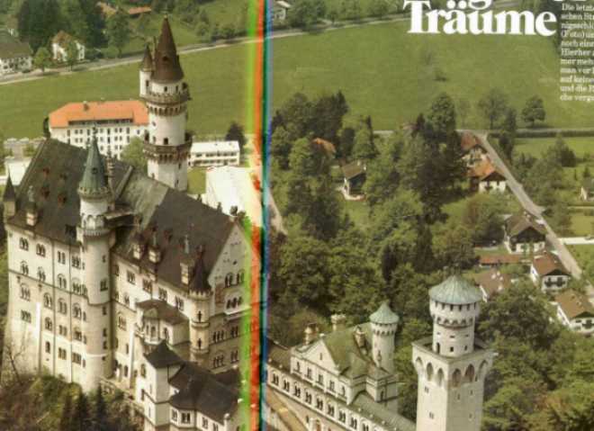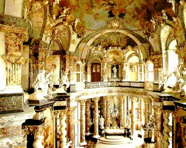 旅の始まりのヴュルツブルクで人々はドイツ・バロック・ロココの粋、司教のレジデンツ宮殿を訪れる。階段の間に足を踏み入れたところで人々は天井に描かれた世界最大といわれる天井のフレスコ画に感嘆の声を上げる。宮殿付き教会では華麗な大理石の支柱の列と、神の国の富裕と栄光を象徴する金箔の装飾、その間を飛び交う白い天使の群れの見事さに目を奪われ、声も出ない。彼らにとってそれが17〜18世紀に造られたオリジナルでなく、第二次世界大戦で破壊され新たに造り直したいわばまがい物であっても、だからといって賞賛の声がトーン・ダウンすることはなく、いやむしろここまで忠実に再建したことで賞賛の声は倍加するし、執着気質とでも言うべきドイツ人の執念は他国人に半ば驚きを伴って敬嘆される。ホストのドイツ人もそこは心得たもので、戦争中の爆撃で灰燼に帰したこの芸術的建築を、如何に並々ならぬ忍耐力と執念で再建したかを最大限宣伝する一方、再建された芸術品については、聞いているうちにオリジナルと錯覚するばかりの見事な説明をする。かくして南ドイツの真ん中を南北に貫くロマンティック街道は大成功を納めた。