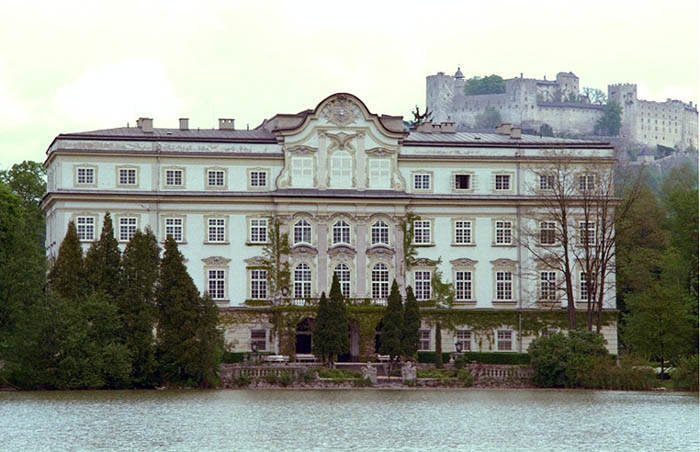 湖に面して立つレオポルドクロン城館。映画の中でトラップ一家の住まいとなっていたシャトーです。後方に要塞。