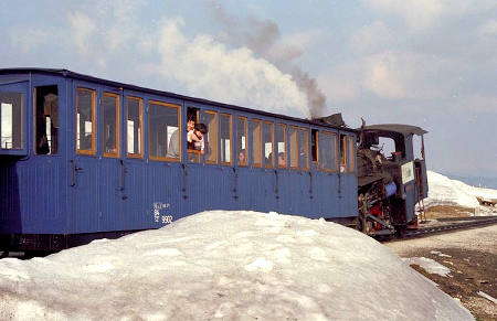 マリアと子供達も乗っていたこの登山鉄道。標高1800mのシャフベルク山頂に立つと眼下にヴォルフガンク湖が、遙か