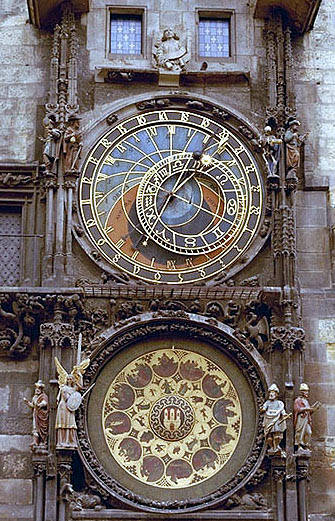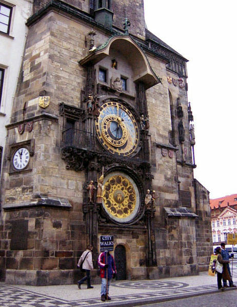 さらに歩くと旧市庁舎前広場に出ます.旧市庁舎壁面の大きな天文時計.天動説に基