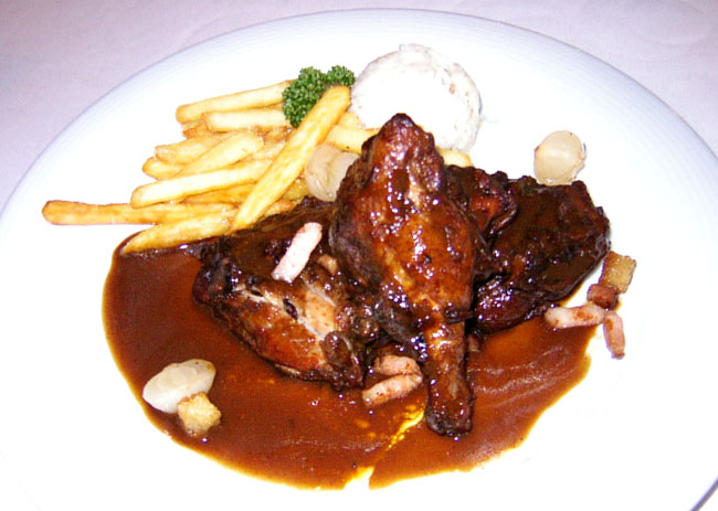 入った甘辛いソースがかかっています.マッシュポテトとポンフリの芋二本立て.