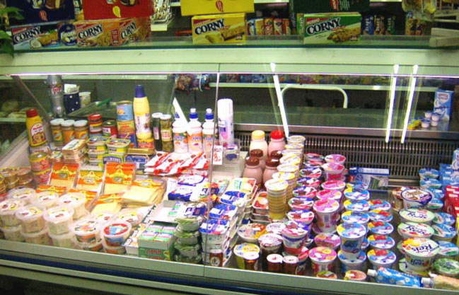 雑然と並べられた駅の売店のヨーグルト,チーズ.