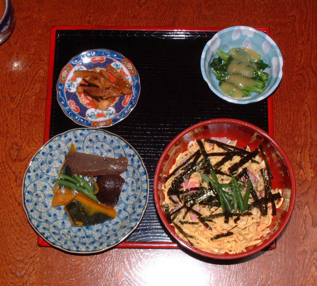 食べたかった「だご汁」は売り切れていたが,ちらし寿司と野菜の煮物で300円.