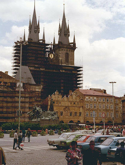 (PRH106 旧市街広場 ティーンの聖母教会 手前にフスの像)