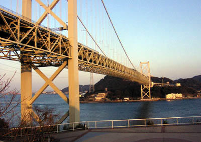 だいぶ長くなった夕日をうけた関門橋。