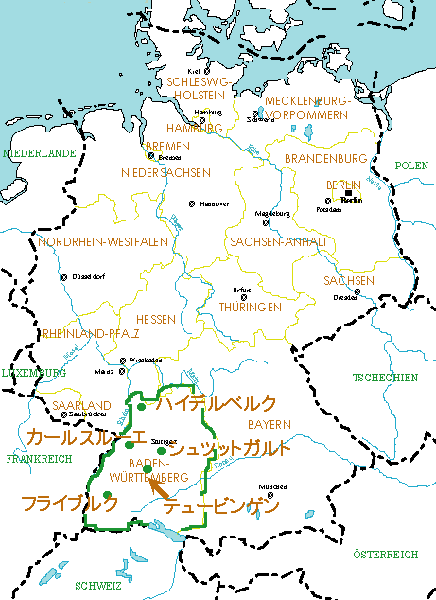 バーデン・ヴュルテンベルク州は南西ドイツに位置します。旧バーデン辺境伯領とヴュルテンベルク王国領が合体して連邦州となりました。東はバイエルン、西はライン川を挟んでフランス、南はスイスに接しています。隣のバイエルン州よりも地形に起伏があって変化に富み、美しく、日本人好みといえます。食べ物もフランスに近いだけあって、バイエルンより量も塩加減も程々に上品です。名物料理にシュペッツレという、ドイツ風パスタがあります。だご汁にいれるだごを小さくしたものを想像されてもいいでしょう。州の東半分がバーデンです。ヴュルテンベルクはシュヴァーベンと呼ばれる地方にほぼ一致します。シュヴァーベンからは優秀な人物が数多く排出しています。ただ、「学校のしぇんしぇい」と正調博多弁なのが耳障りです。