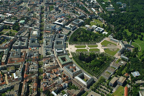 カールスルーエは最高検察庁、憲法裁判所、最高裁判所などが集まる司法の町です。城館左上部の建物群がそうです