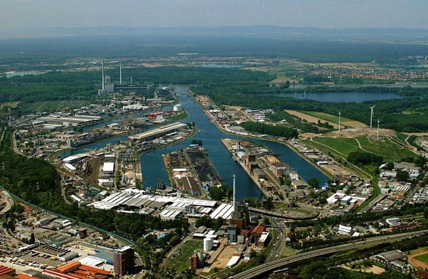 海から800kmくらい離れた内陸にあるライン川港。日本には見られない風景です。右手に風力発電塔。