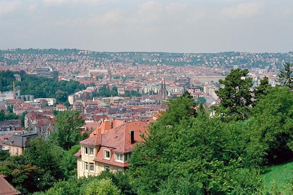 シュツットガルトは人口100万人弱の大都市ですが、「住みたい町」で毎年1位を競う人気があります。この町は街全体が古代ローマの円形劇場のように三方をぐるっと丘に囲まれ、最も低い舞台に当たるところに街の中心があります。別名を風の街とも言い、常に風が台地から街の底に吹いています。現在の都市計画でも街の中を自然に風を通すことに配慮が為されています。そしてご覧のように緑が多い。