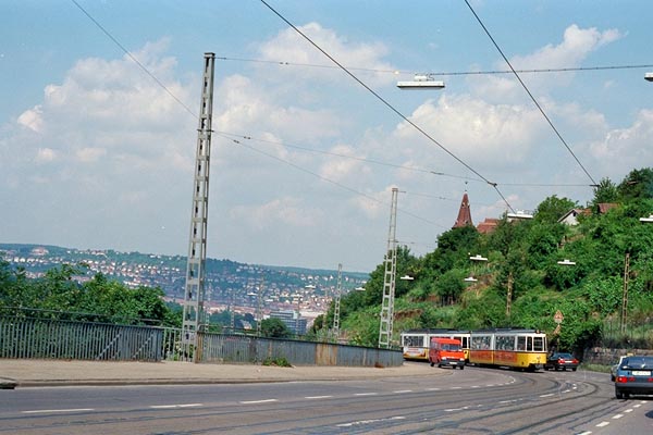 こういう地形なもので早くから都心と丘の上を結ぶ市電が発達しました。大都市には珍しいケーブルカーもあります。写真の通りは「新ワイン昇路」。大都市の中でワイン畑があるのはここシュツットガルトだけです。