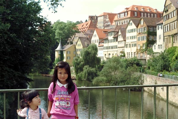 ネッカー川もこんなに小さくなった。ここまでは船も上がってきません。この近くにドナウ川源流もありますが、飛び超えられそうなせせらぎです。背景の小さな塔は哲学者ヘルダーリンが心を病んで幽閉されていたので、ヘルダーリンの塔と呼ばれています。