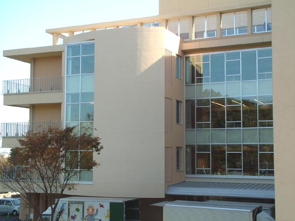 外観はこんなところです。ガラスのカーテンウオールの下方、引っ越しのトラックが止まっているところが玄関です。