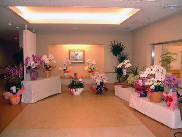 玄関を入ったホール。お花や観葉植物をどっさり頂きました。間接照明が第一印象を良くしたようです。