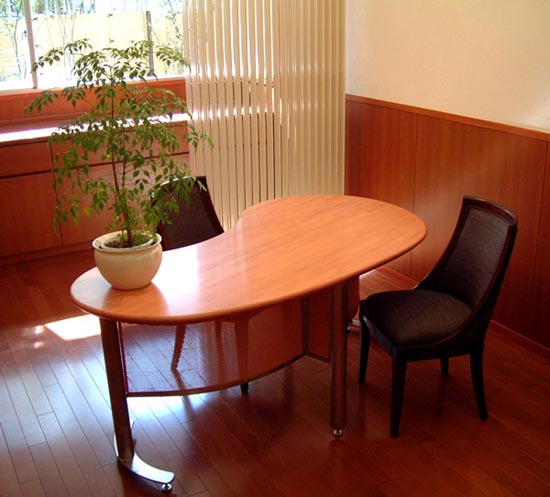 これは第1診察室。南ドイツ風赤みがかった木貼り内装と、モダン・イタリアンの診察机。