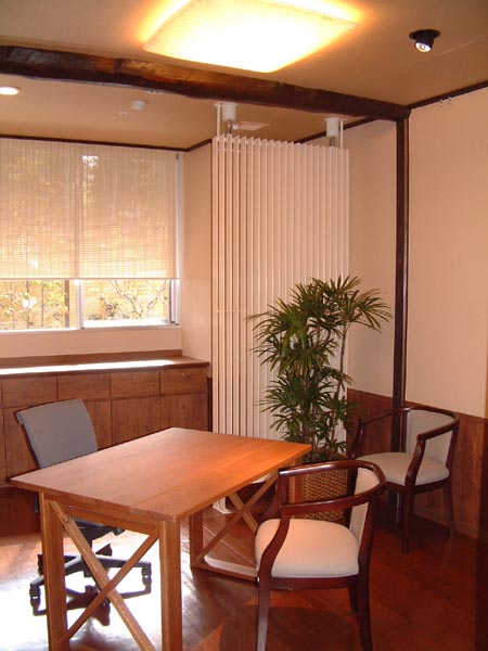 第2診察室は和風。和紙を貼った温白色の照明。天井には解体した旧家から持ってきた梁。窓には御簾(みす)風ロールカーテン。