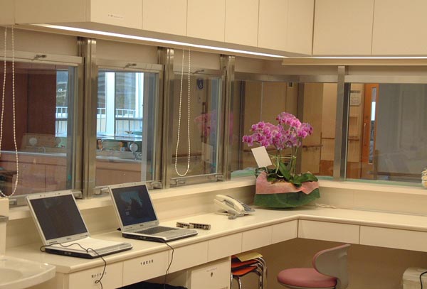 ナース・ステーション。新館にはパソコンを約50台設置しました。一気に30台増です。各階ナース・ステーションには6台ずつ置きます。