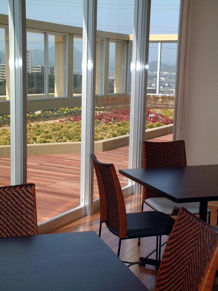 カフェテラス・イタリアから屋上庭園を見たところ。面会に、気分転換に、作業療法の一環に。