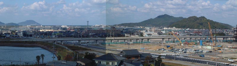 左奧には今年3月の地震で有名になった玄界島。高架はJR九州筑肥線。写真右はみ出たあたりに新駅「九大学研都市」が今年9月開業しました。