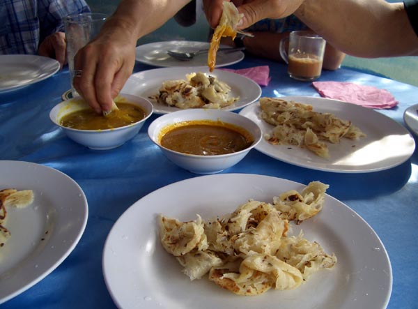 カレーとナン。慣れると指先をほんのちょっとカレーに浸すだけで、上手に食べるとか。