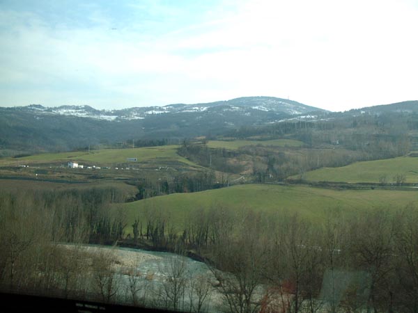 ボローニャで列車は進路をほぼ90度変え南西に進みます。するとまもなくトスカナ州に入り、車窓には比較的なだらかな山岳地帯が広がります。雪が残っています。アペニン山脈を越えるのです。