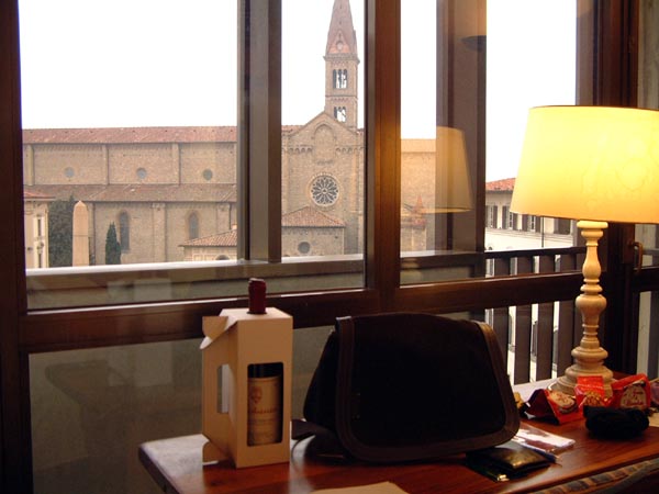 フィレンツェ中央駅がサンタ・マリア・ノヴェラと呼ばれるのは、駅を出ると目の前に由緒あるサンタ・マリア・ノヴェラ教会が立っているからです。ホテルの窓から見えているのがそうです。つまりこのホテルには駅から歩いていきました。偶然ですが、25年前泊まったホテルでした。