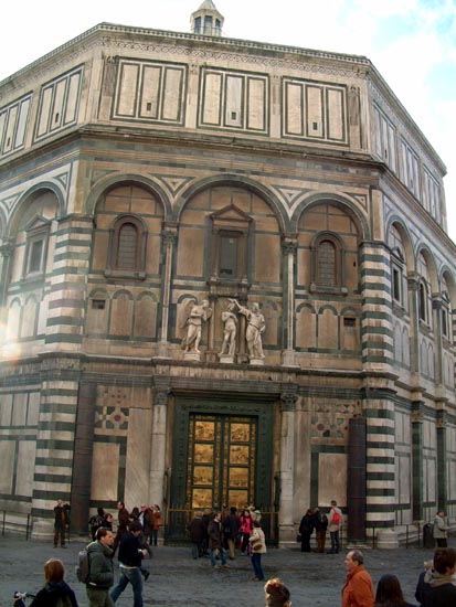 話をフィレンツェに戻して、これはドゥオモに向かい合って立つサン・ジョヴァンニ(聖ヨハネ)洗礼堂。今は少しくすんでいるが、磨き直せば緑、白、赤の美しい大理石が再現することでしょう。12世紀頃の建立で尖型アーチは無く、ローマ人が多大に活用した円形アーチで修飾した、典型的なロマネスク様式です。