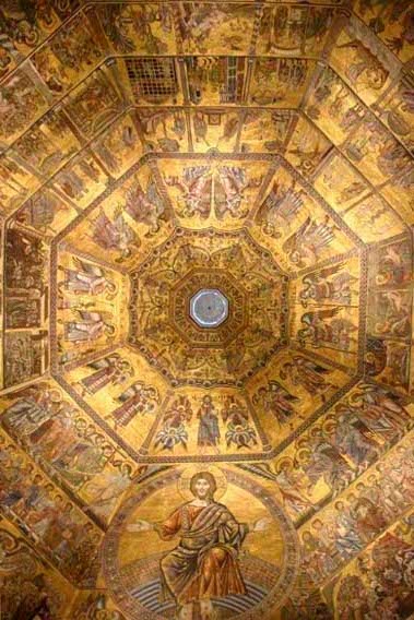 洗礼堂は正八角形なので、天井も八角蓋。やはりキリストを中心に使徒や天使や聖書の中野逸話がモザイクで描かれています。