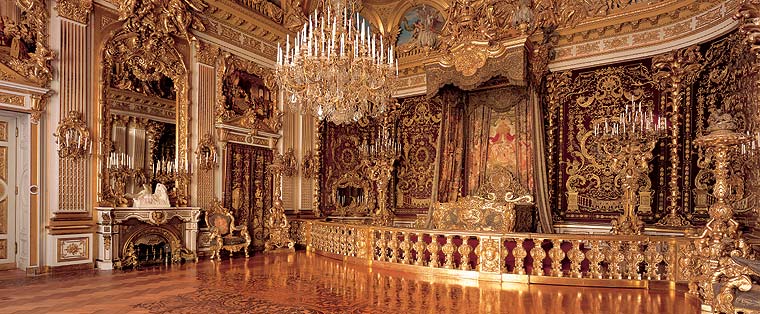 ヘレンキームゼー城。国王の寝室。これもヴェルサイユをそっくり模倣したのでしょう。ルイ14世は朝の洗顔から排便まで、すべて儀式として行ったそうです。すごい心臓の持ち主ですね。ルートヴィヒ2世も実際このベッドで寝たそうです。