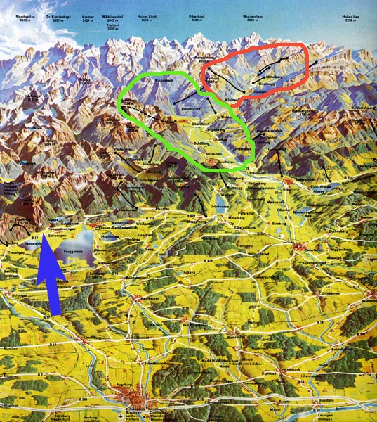 ノイシュヴァンシュタイン城は図の左隅(矢印)、アルプス山塊の小高い山の上にあります。背景雪をかぶったアルプスの、