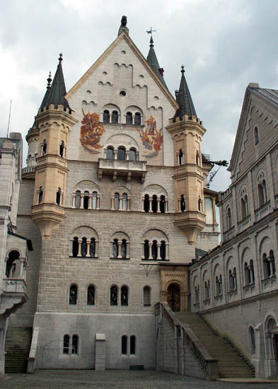 ロマネスク様式の柱が並ぶ窓と、塔を模した左右の出窓が特徴的ですが、入り口は拍子抜けするほど質素なものです。行く度にこれは国王の入り口なのか、使用人の勝手口なのか迷いました。映画「ルートヴィヒ」ではここが出てきましたね。はるばる尋ねてきたエリザベートにルートヴィヒの家来が「国王陛下は、どなたにもお会いにならないそうです」と伝えるシーンでした。エリザベートは階段をドアの前まで上り切ることなく、きびすを返して去りました。