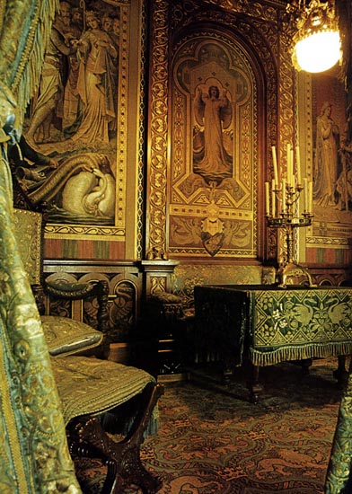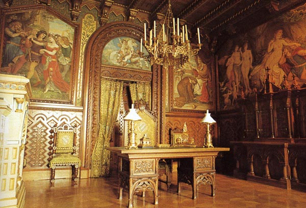ニュー・ゴシックが基調です。ゴシックは中世に流行った古い様式なので内装素材も乏しく、木が中心となりました。この部屋も壁や天井や机の木材に美しい彫りが施されています。部屋部屋の壁には幾つもの絵が施されています。すべて彼が心酔した