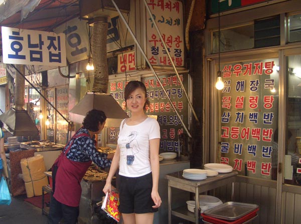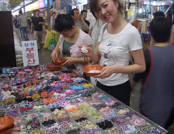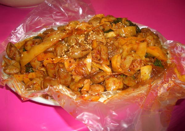 海鮮鍋をいただき、夜の東大門市場をブラブラと