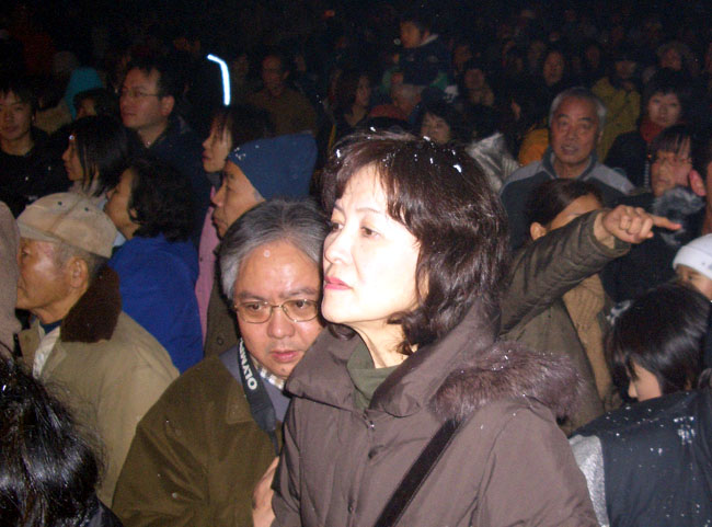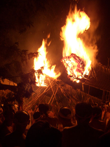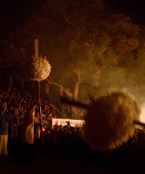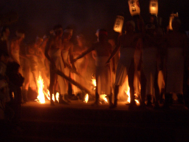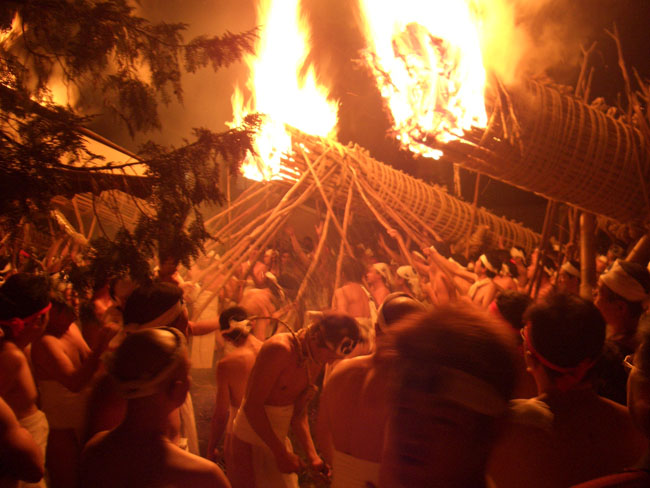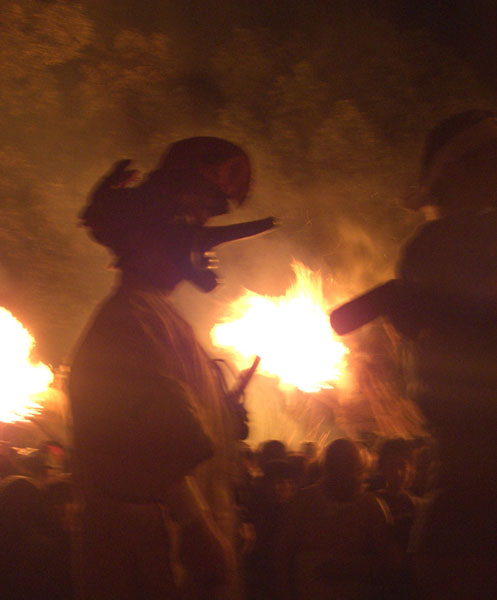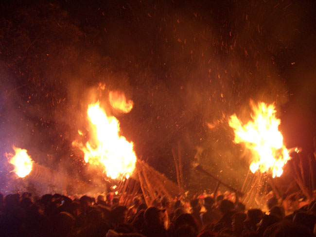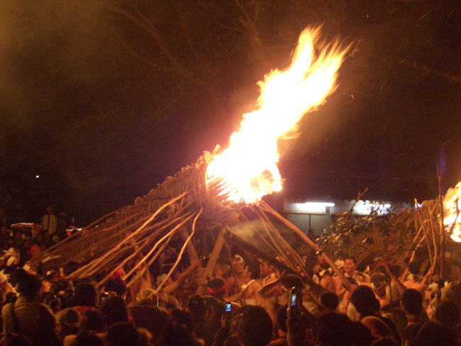 大松明からは盛んに火の粉が降りかかる。