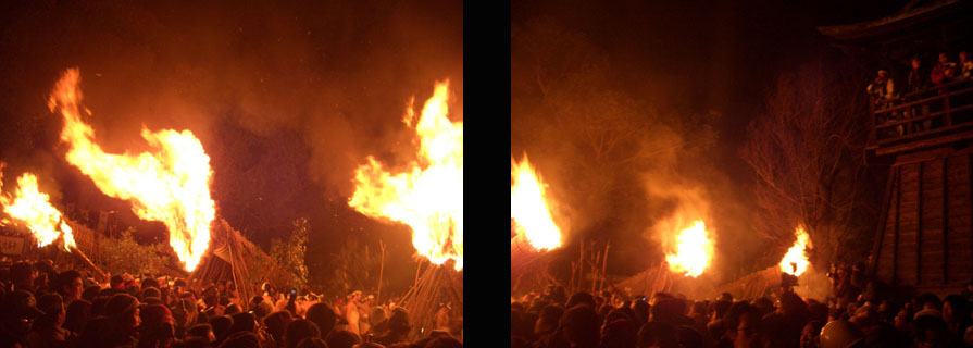 境内の照明が消され、真っ暗になった中、突然鬼の堂前に並べられた六基の大松明に火がつけられます。