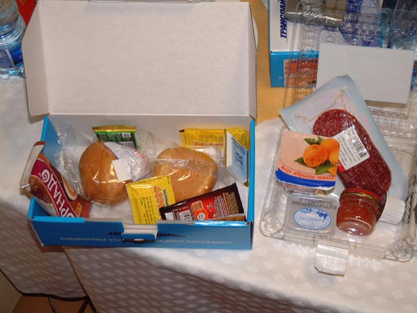 中身はパン2個、バター、サラミ、ママレード、キャビアならぬイクラ、紅茶、コーヒー、ガス入りとガスなしの