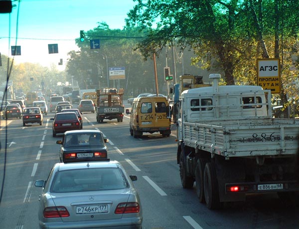 モスクワの朝。いずこも同じ渋滞。乗用車は日欧と変わらないが、トラックは古めかしいのが多い。ロシアで