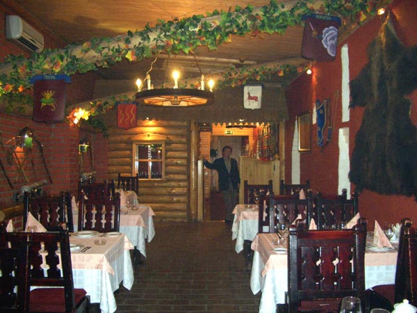 ある晩の民俗調レストラン。右手の壁には熊の毛皮。左手の壁には日本製エアコン。