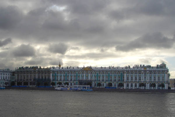 ネヴァ川から見た冬宮。ロシア帝国・ロマノフ家の居城。圧政の本拠地。革命の舞台。現在はエルミタージュ美術館という、世界最大規模の美術館です。ネヴァ川は東から西に流れ、バルト海に注ぎます。