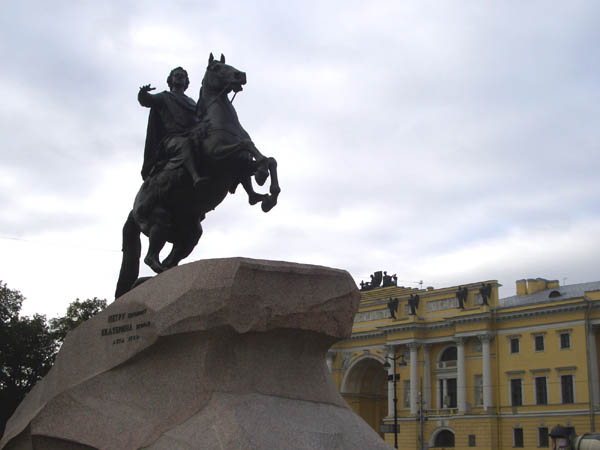 開祖ピョートル大帝の騎馬像。後方は旧元老院。ピョートルはスウェーデンとの戦争に勝ってこの地を奪い取ると、バルト海への出口を確保するためすぐさま家臣達に命じて都市建設に着手し、首都をモスクワから遷都し、信奉していたロシア正教の使徒聖ペテロに捧げる都市、サンクト・ペテルブルグと名付けました。18世紀初頭のことです。