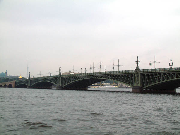 ネヴァ川にかかる橋。ネヴァ川に架かる橋はすべて開閉橋です。午前0時から4時まで橋中央部は開いているそうです。この橋はたしか焼酎メーカーがテレビコマーシャルに使っていました。なかなか美しい橋です。ネヴァ川は近くの湖からバルト海までの数10キロ程度の短い川ですが、船舶は河川と運河を渡り継いで黒海に抜けることが可能だそうです。すごいですね。