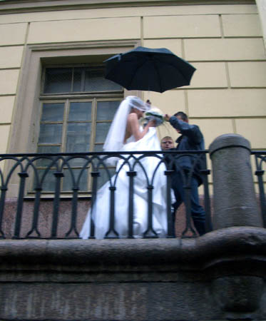 雨の中、結婚式に急ぐカップル。日本のような大々的結婚式産業は無いそうです。教会または役所で式を挙げて、ピョートル大帝騎馬像を背景に記念写真を撮り、レストランで家族と友人達を招いてパーティとか。