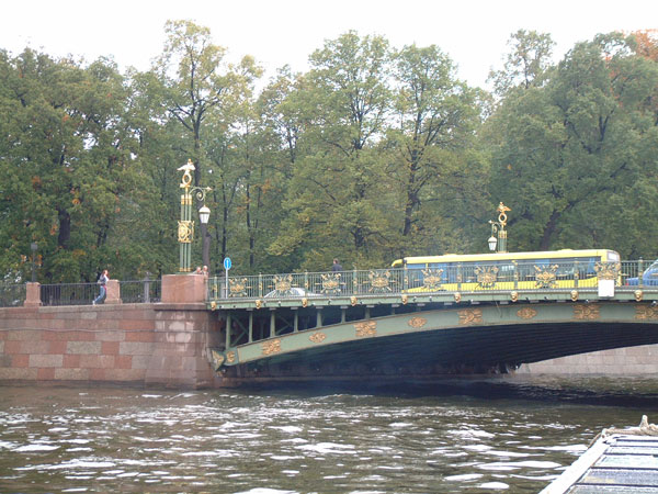 美しい装飾のある橋。緑も多い。2006年7月に当地で主要国首脳会議(G8サミット)が開催され、ロシアはこの時とばかり国を挙げてこの町の化粧直しをしたそうです。