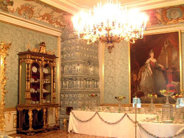 この宮殿のペチカはほとんどデルフト製タイルで装飾してありますが、それはピョートル大帝がオランダを愛したからです。ペチカはロシアだけでなく、北ヨーロッパの大邸宅で広く普及しました。タイル張り暖炉とも言います。壁の裏側に使用人用通路があり、そこで薪を燃やします。