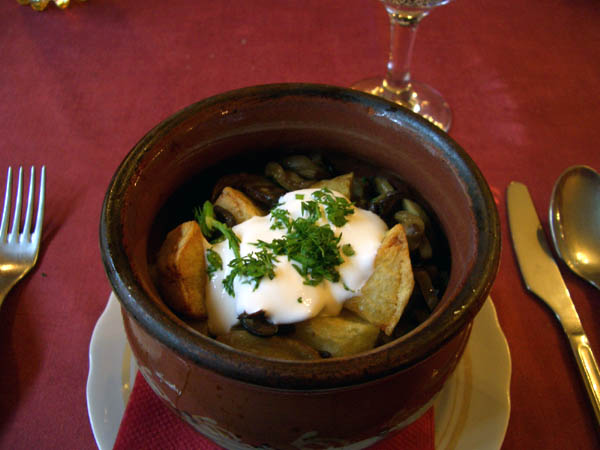 食事は毎回このような「壷もの」が出てくる。寒い国だから、こういうのが好まれるんだろう。肉、芋、キノコなどが入っている。これは生クリームがかけてある。美味しいけど、ちょっと食べにくい。