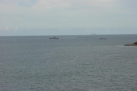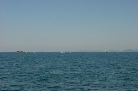 右が平瀬。ラサ・サヤンは平瀬の際に錨を降ろしていた。遠くに玄界島が見える。